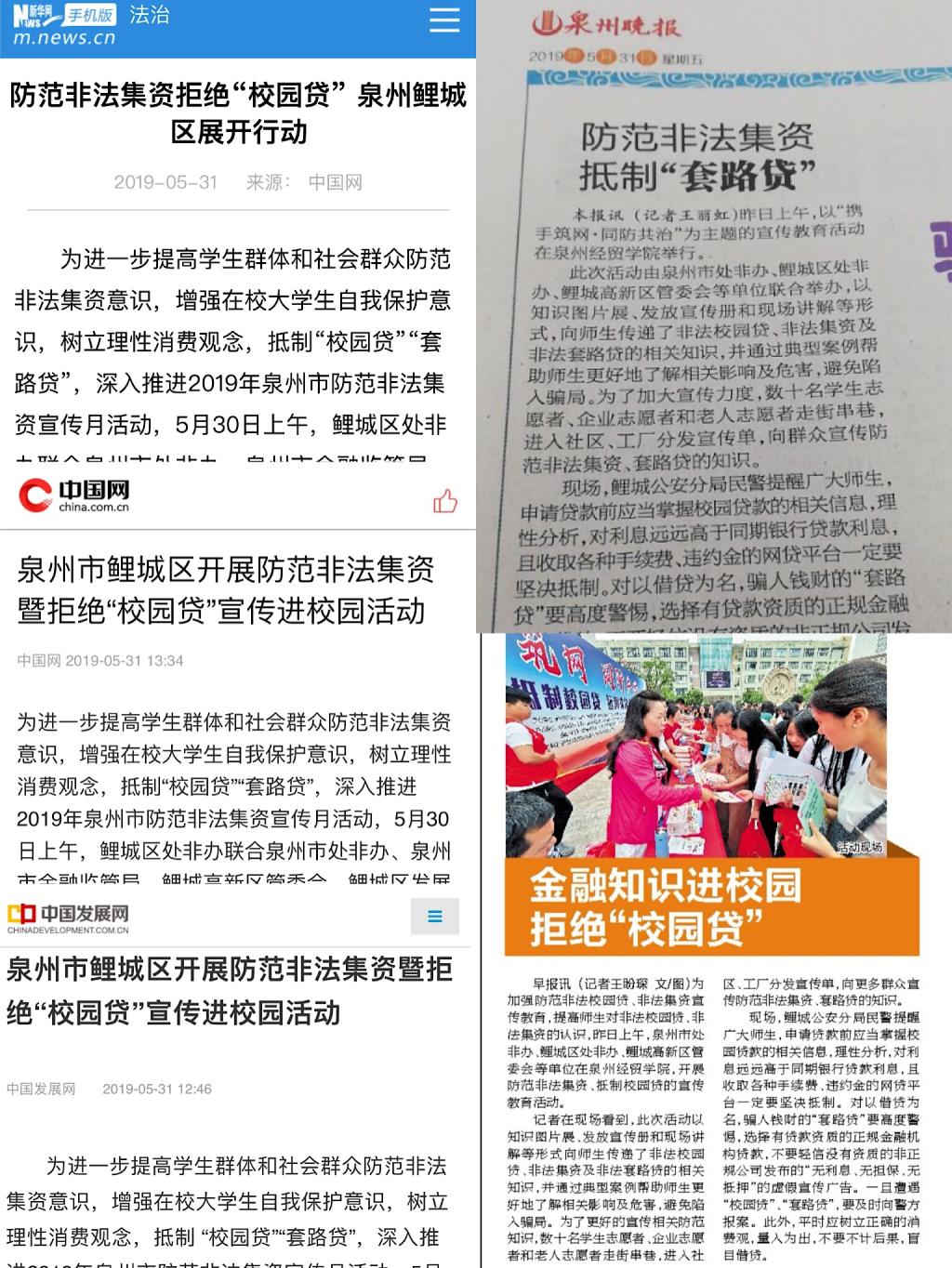 通过此次现场宣传活动,让广大师生对“校园贷”“套路贷”有了更清晰的了解和认识,进一步提升了防范意识,取得了良好的效果。同时本次防范非法集资宣传活动得到新华网、中国网、中国发展网、东南早报、泉州晚报等社会媒体的广泛报道。
