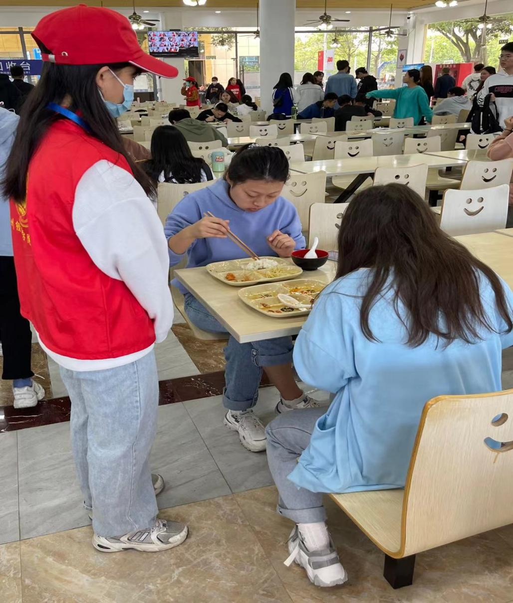 团委会负责学校一餐食堂、青年志愿者协会负责二餐食堂、学生会负责三餐食堂,在就餐高峰期有序引导师生进入食堂就餐,食堂秩序井然。食堂门口、就餐位置旁、倾倒餐余垃圾处都可以看见志愿者们认真的身影,监督饭菜剩余以发扬光盘精神和捡起地上的垃圾。他们尽心尽力维护食堂就餐秩序,引领文明就餐新风尚。