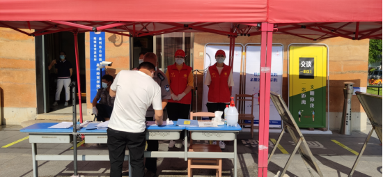 “文明督导组”负责倡导学生非必要不出校,在校门口、食堂、大礼堂等公共场所进行体温检测并提醒师生佩戴口罩,保持一米距离。