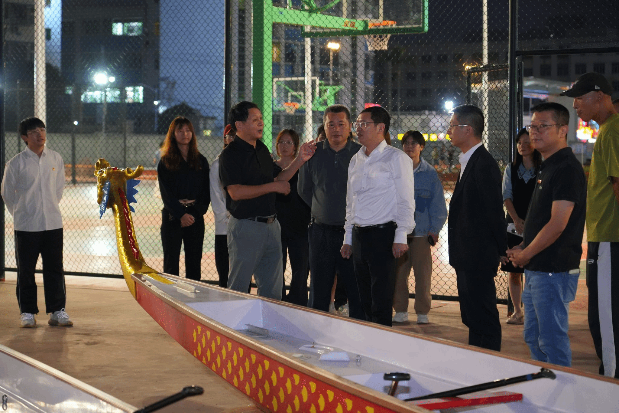 在龙舟池边,张阿峰深切关心龙舟队的训练安全情况,详细询问了龙舟队的日常训练安排、安全措施以及队员们的身体状况。他强调,龙舟训练是一项高强度、高风险的体育活动,必须始终把安全放在首位,确保队员们在安全的环境下进行训练。同时,他对队员们刻苦训练、积极向上的精神风貌给予了高度评价。对于龙舟队的发展,张阿峰提出了宝贵的意见和建议。他指出,龙舟训练和比赛要注重流程化、团队协作和“传帮带”。即,要通过科学的训练方法和流程,提高队员们的技能水平;要加强团队协作,培养队员们的默契和配合能力;要注重“传帮带”,让经验丰富的老队员帮助和指导新队员,共同推动龙舟队的发展。