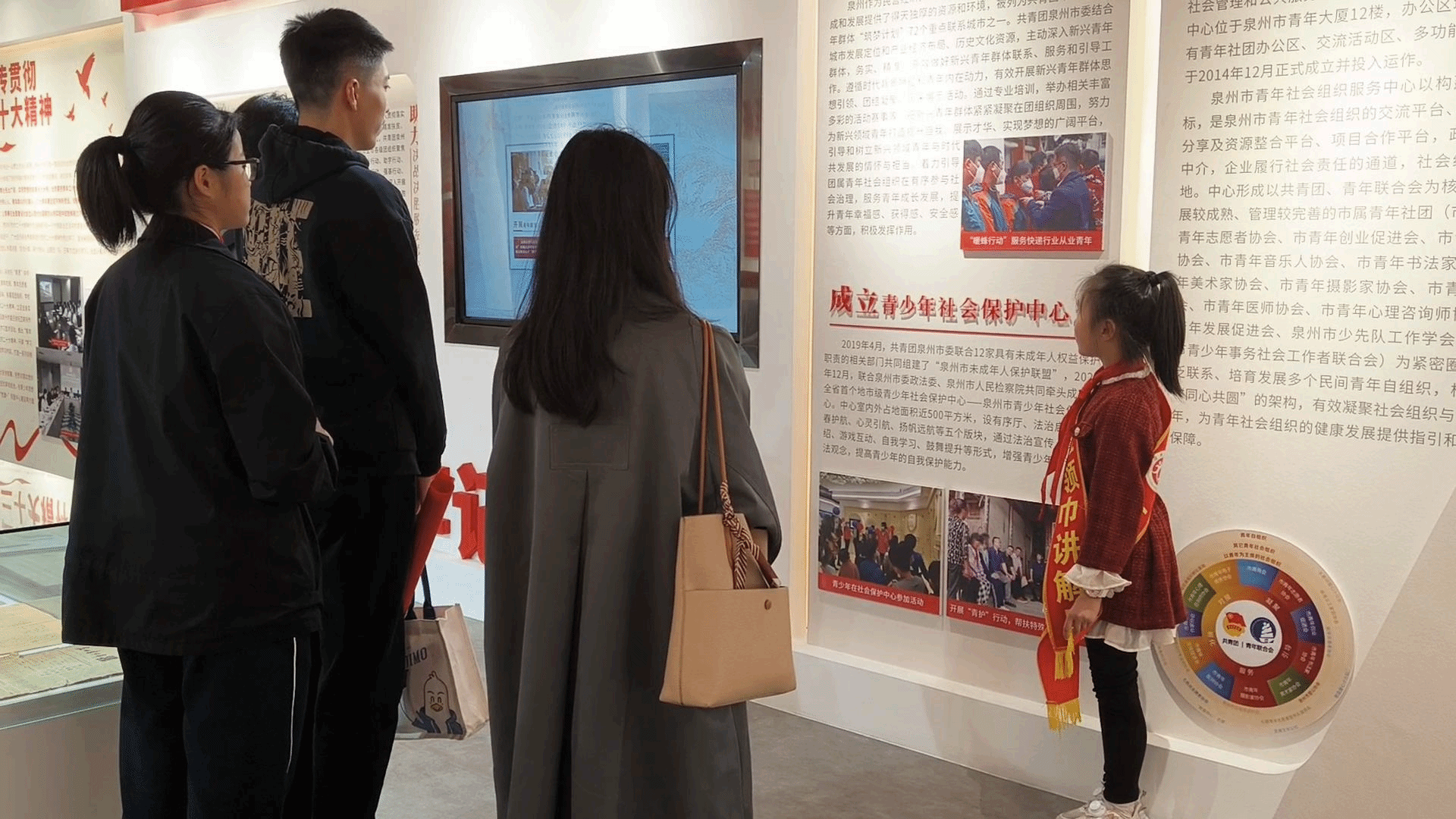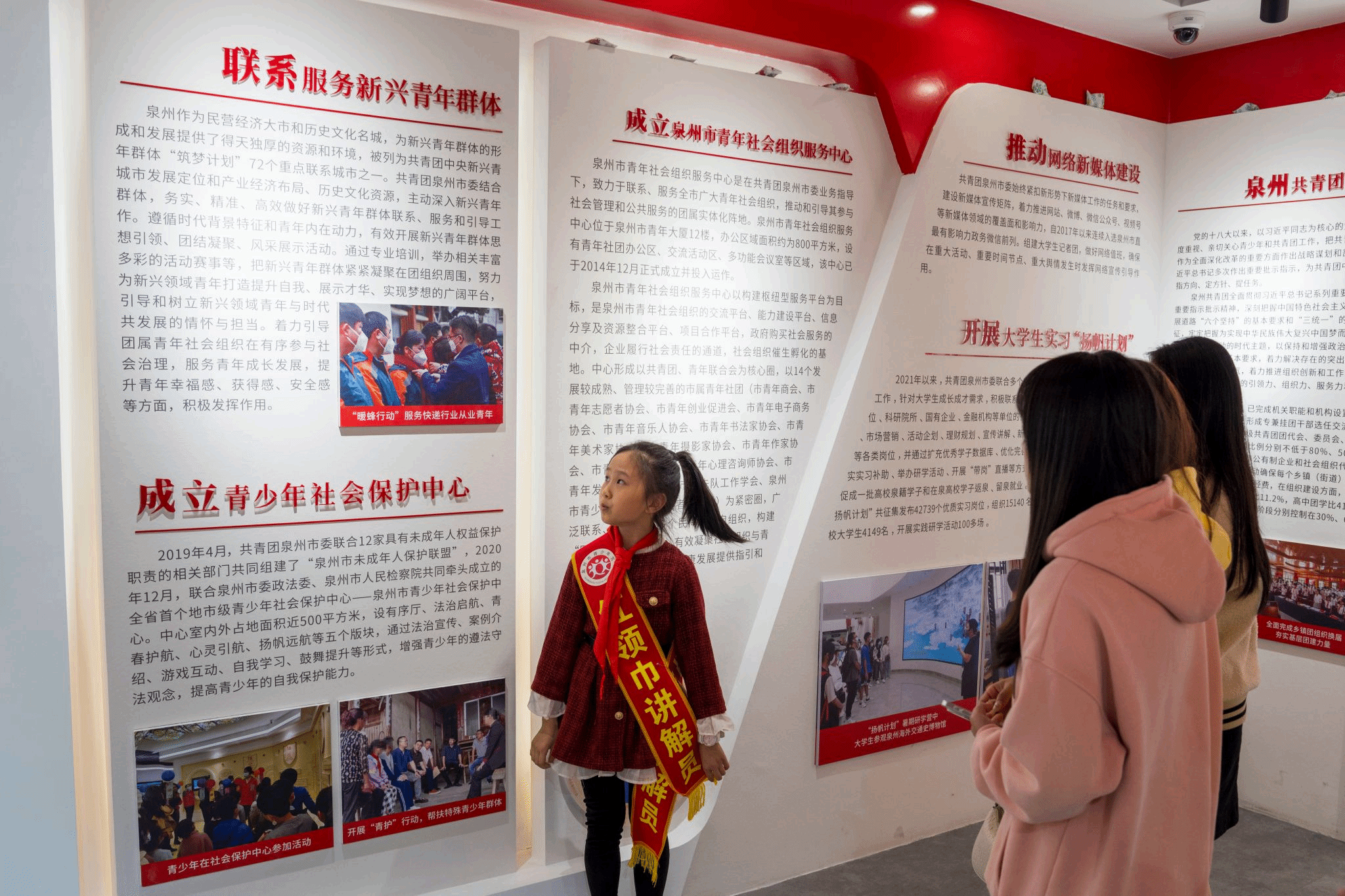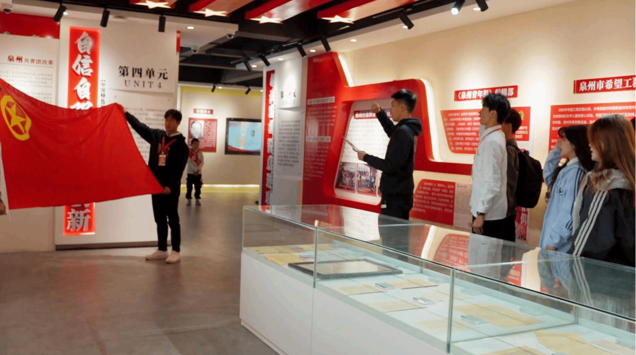 泉州青年运动史馆是传承和发扬泉州青年运动精神的重要平台载体,展馆由“浴血奋战、百折不挠”“自力更生、发奋图强”“解放思想、锐意进取”“自信自强、守正创新”四个单元组成,展示了党领导下的泉州百年青年运动史和一代代团员青年矢志不渝、奋斗建功的风采风貌。社团全体团员还在馆内面向团旗重温了入团誓词。