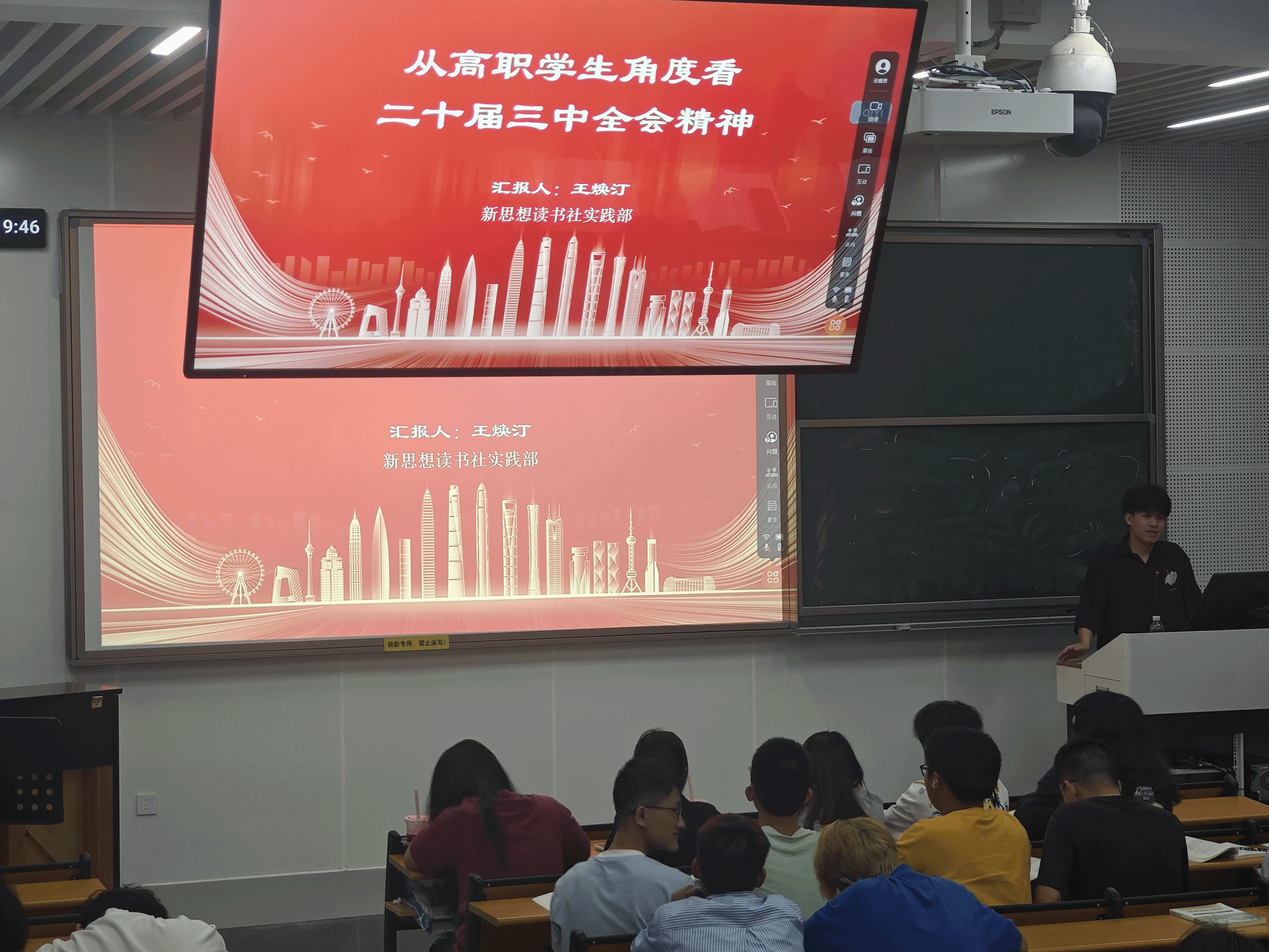 “实践是检验真理的唯一标准,我们要积极参与学校和社会实践,将所学知识运用到实践中去。”新思想读书社实践部的成员说到。成员们以《从高职学生角度看党的二十届三中全会精神》为主题,结合“中共中央关于进一步全面深化改革、推进中国式现代化的决定”及中国共产党第二十届中央委员会第三次全体会议公报,向同学们讲解党的二十届三中全会精神及中国式现代化与民族复兴、国家富强的深刻联系,号召同学们将个人命运与祖国命运相联系,让青春为中国式现代化挺膺担当。同学们都表示,作为高职学生,要深刻领会全会精神,将其转化为推动自身成长成才的强大动力,以更加昂扬的斗志、更加务实的作风,努力成为新时代有理想、敢担当、能吃苦、肯奋斗的青年,为实现中华民族伟大复兴的中国梦贡献自己的力量!